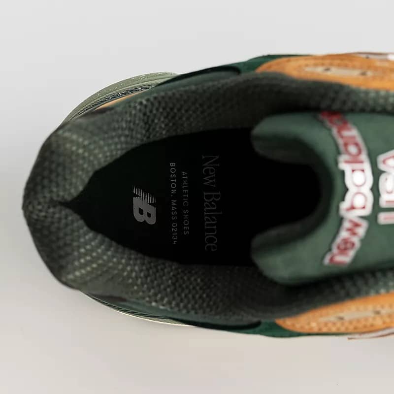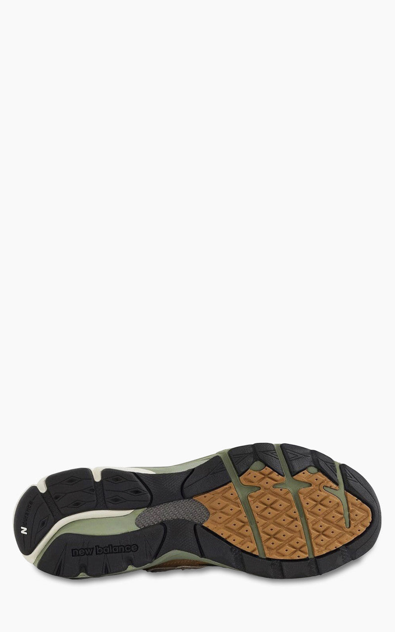 New Balance M990WG3は、ライフスタイル向けのスニーカーで、ブラウン、グリーン、ブラックの配色が特徴です。
