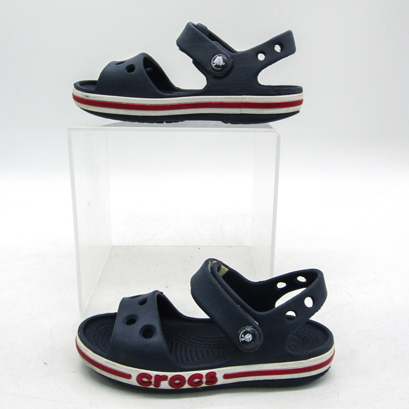 ネイビーの花柄プリントが特徴のキッズ用クロックスサンダル。